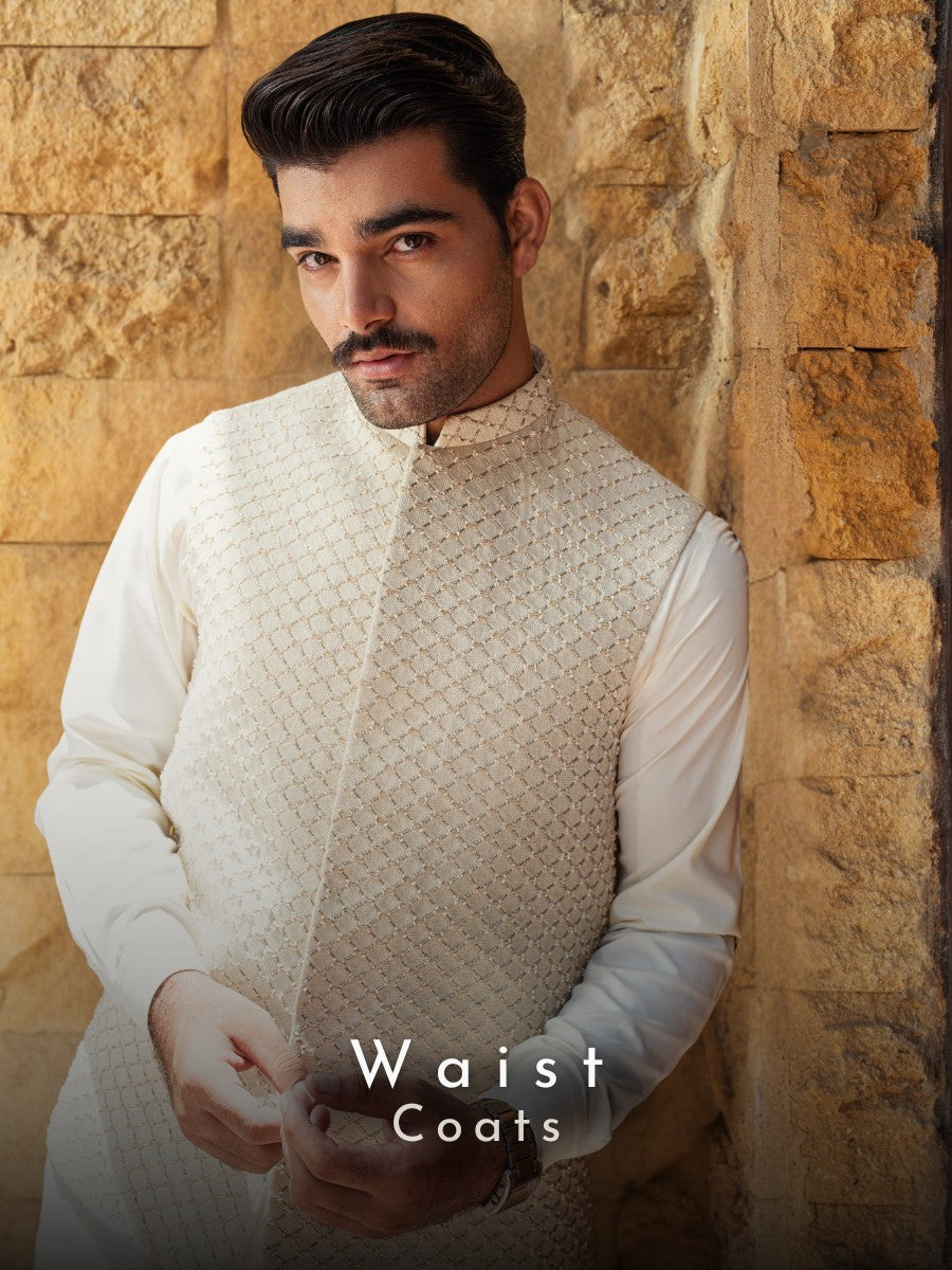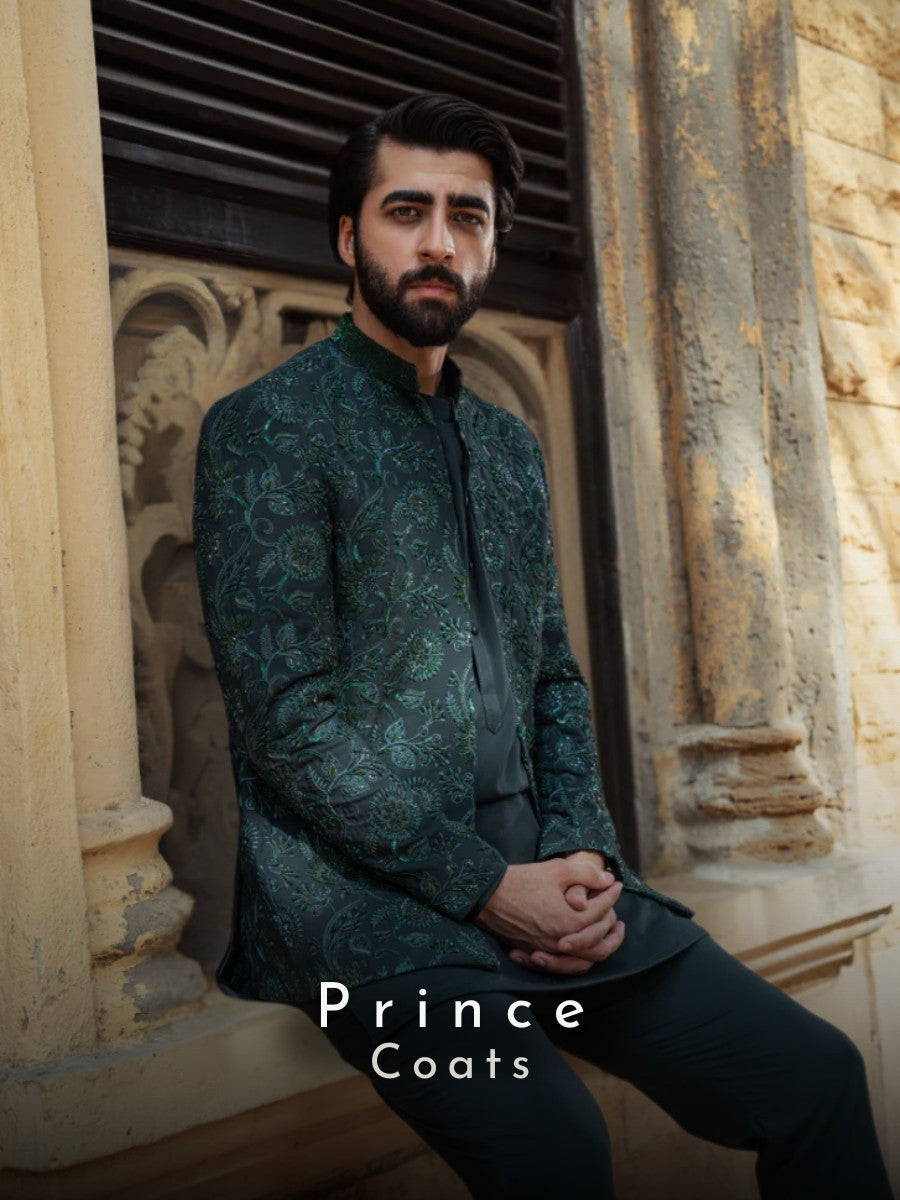 Quickshop A commanding, long black sherwani with a high collar. Its key feature...