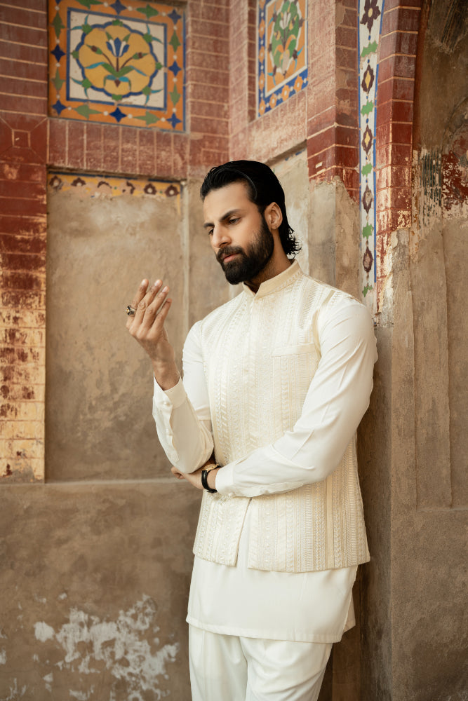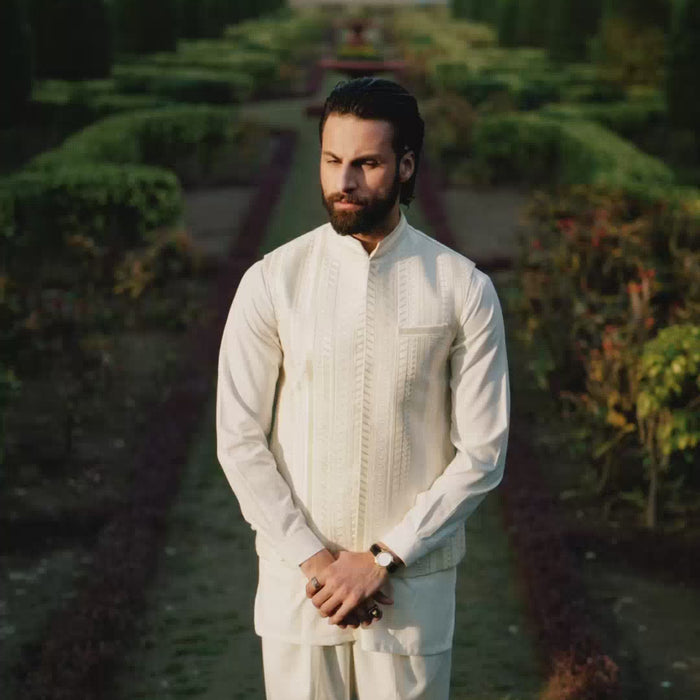 Soft off-white cotton silk elevated with subtle threadwork and tailored trousers.