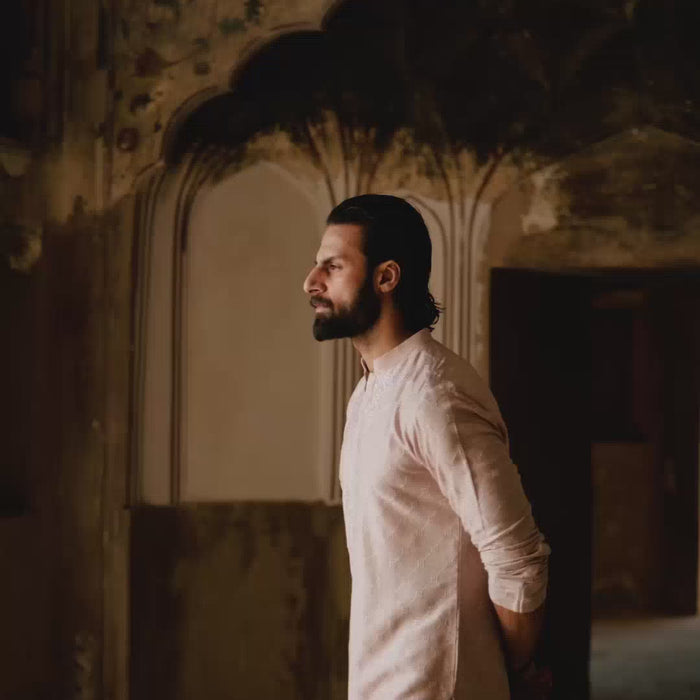 • Soft pink cotton silk adorned with intricate threadwork, paired with a straight-fit trouser.