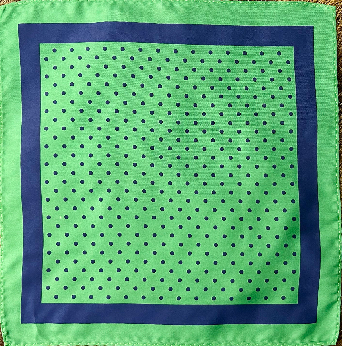 A fresh and vibrant pocket square featuring navy polka dots on a bright green background, framed by a bold navy border a playful yet refined accessory for a sharp, modern look.