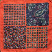 A bold multi-pattern pocket square featuring intricate paisley and geometric designs in navy, yellow, and green tones on a rich red base a vibrant accessory that adds character and elegance to any outfit.