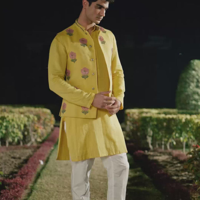 Rich cotton silk kurta paired with a crisp straight-fit trouser for a refined statement.