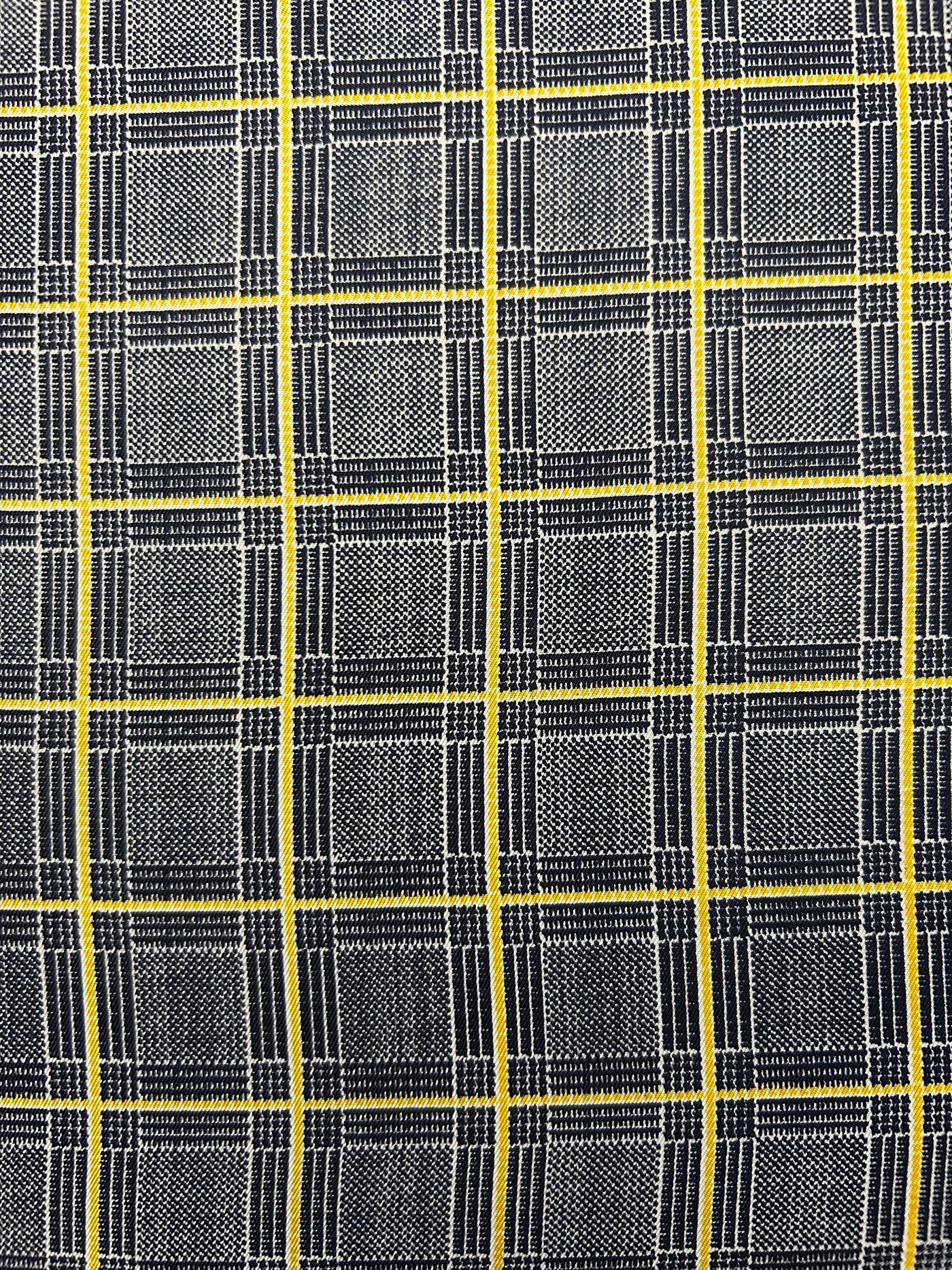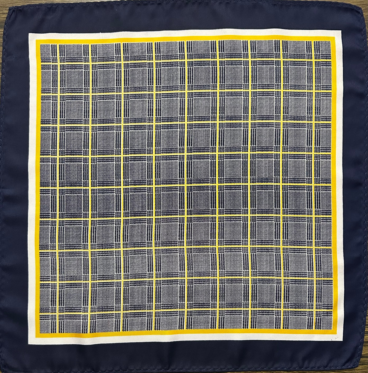 A refined pocket square featuring a navy and white check pattern accented with yellow lines, framed by a bold yellow and navy border a perfect mix of classic style and modern flair.