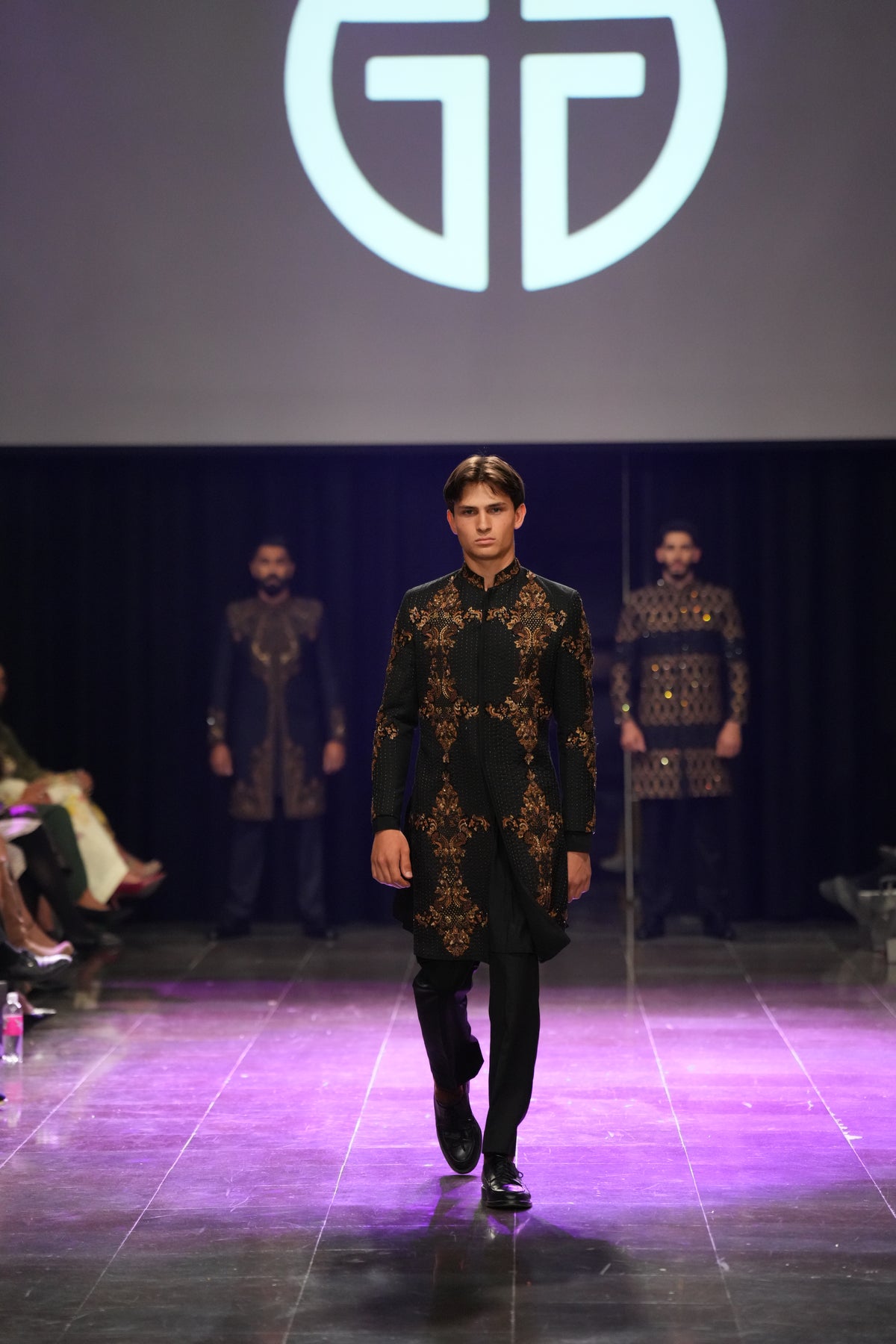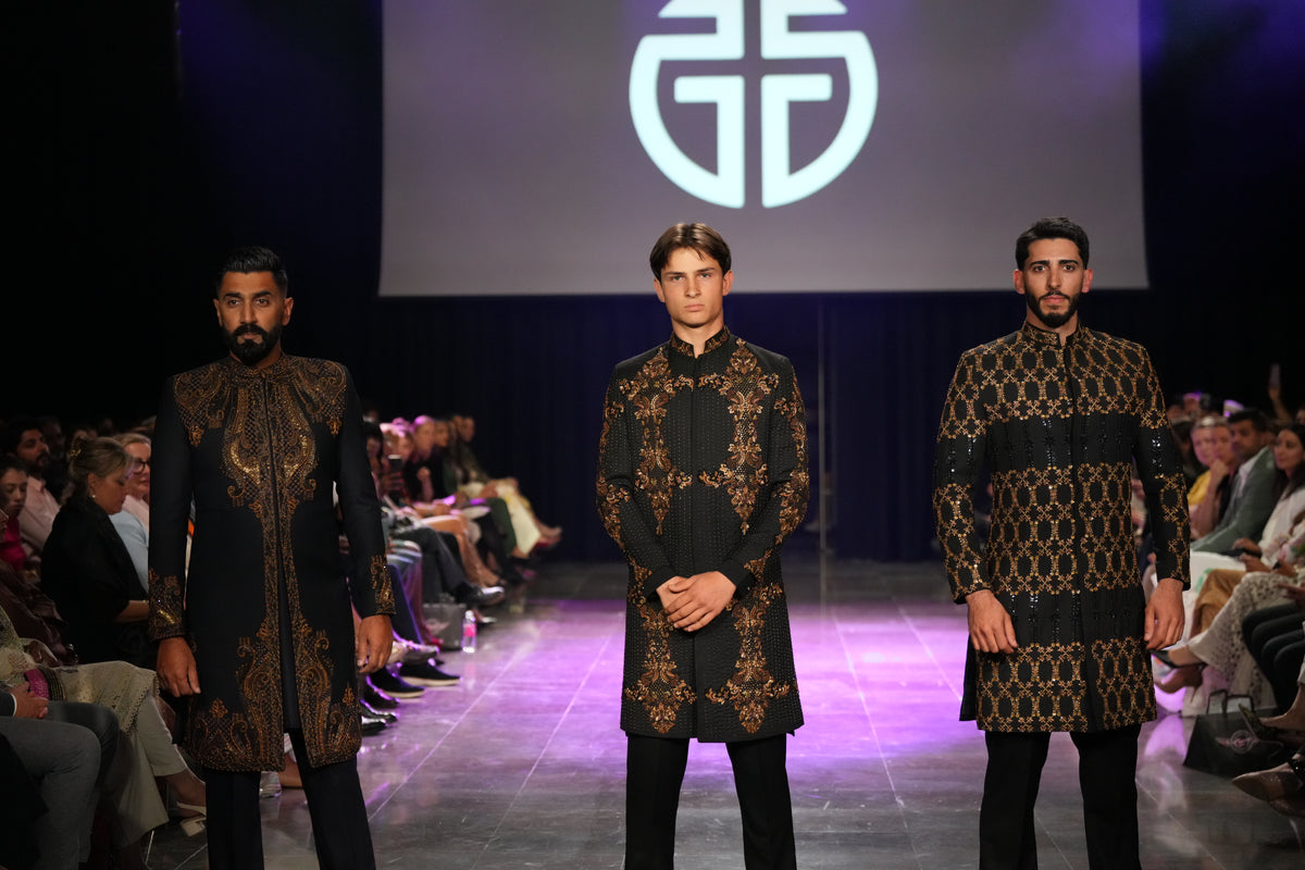 A commanding, long black sherwani with a high collar. Its key feature is the heavy gold Zari embroidery concentrated on the chest, collar, and cuffs, creating a powerful, regal contrast. This is an ideal, sophisticated choice for groom wear and black-tie formal events.